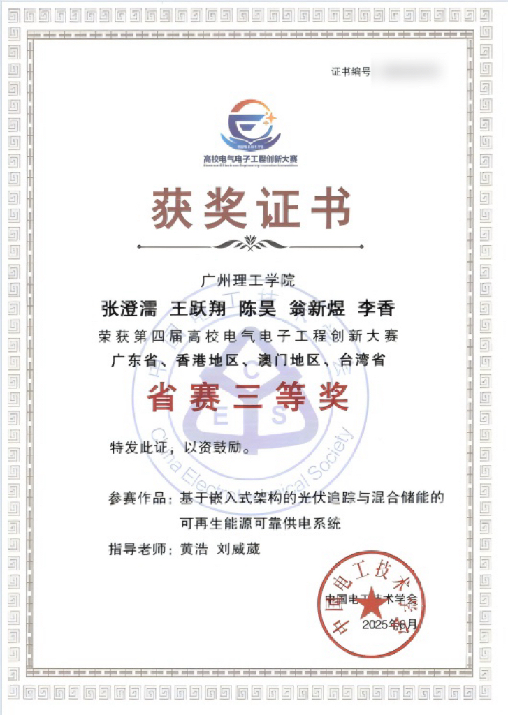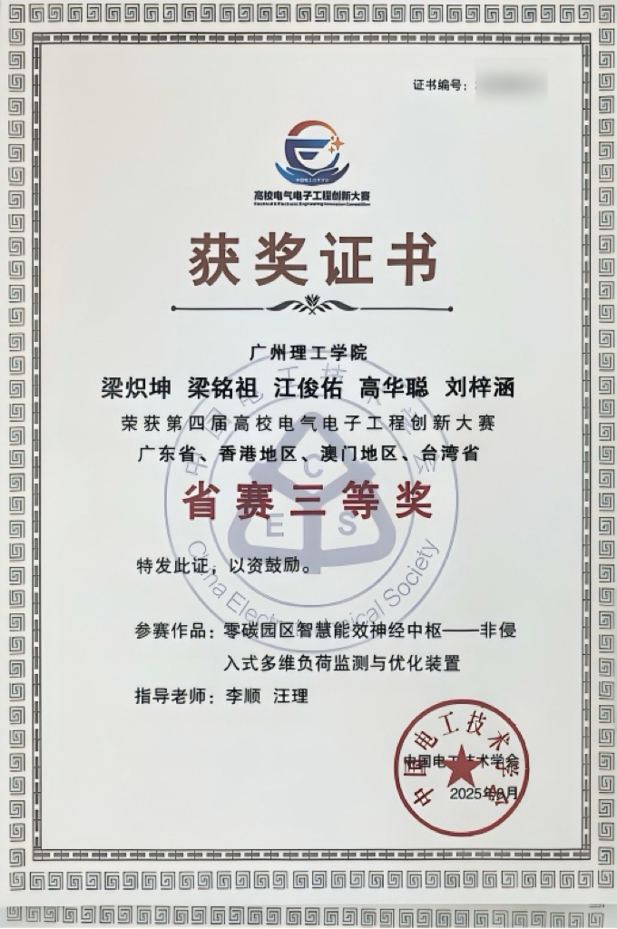 近日,由中国电工技术学会主办的第四届高校电气电子工程创新大赛于8月中旬圆满落幕。由太阳成tyc7111cc黄浩、刘威葳、李顺、汪理四位教师指导的两支参赛队伍,历经初赛严格筛选与省赛激烈角逐,凭借扎实的专业基础、创新的技术方案与出色的实践表现脱颖而出,最终双双斩获省级三等奖,充分展现了公司在电气电子工程领域的教学成果与员工创新实力。
