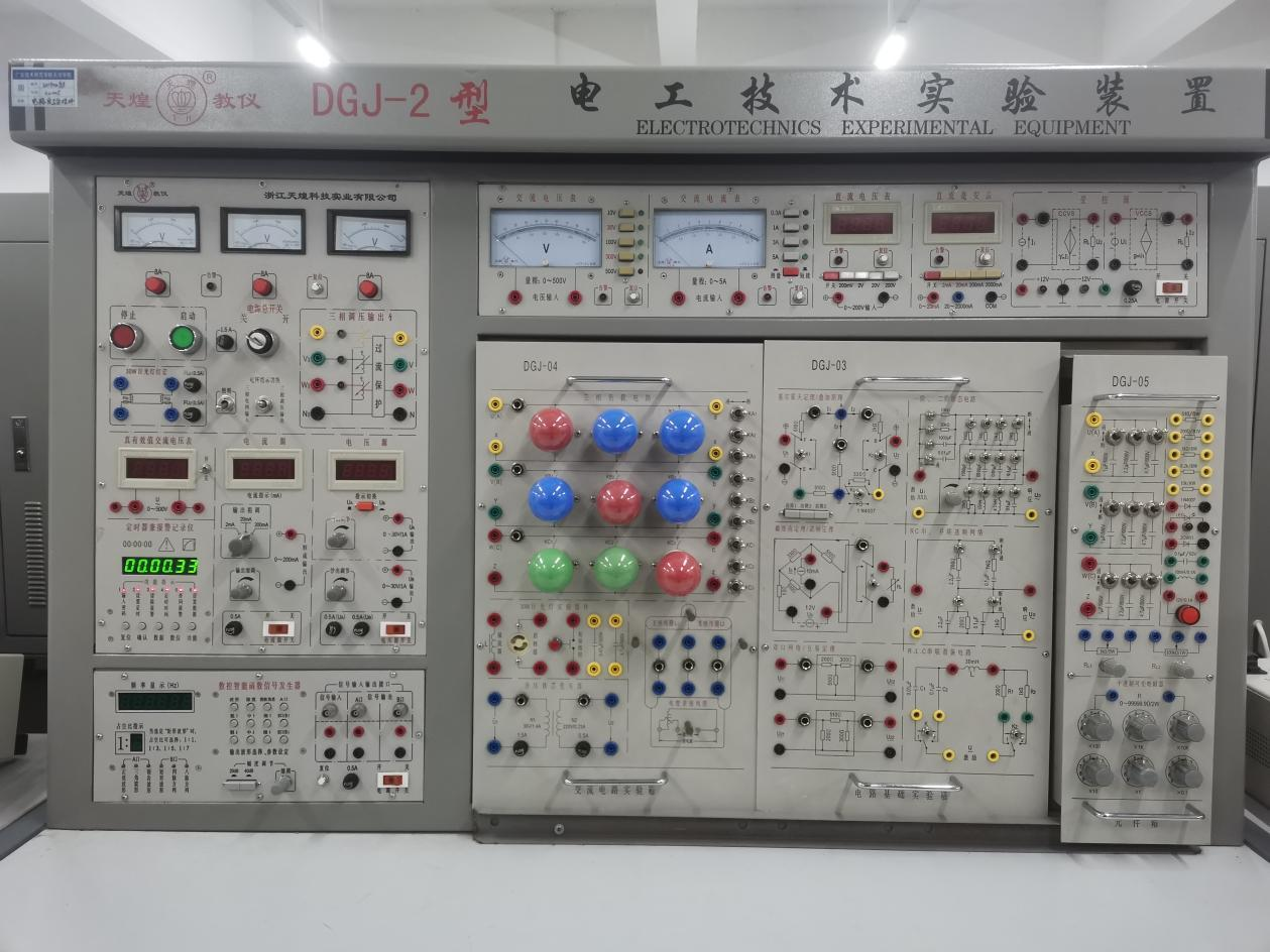 主要仪器设备:主要设备有DGJ-2电工技术实验装置、电路基础实验箱、交流电路实验系统、元件箱系统、单相智能功率、功率因数表、受控源、回转器、复阻抗变换器等配套挂件100件。