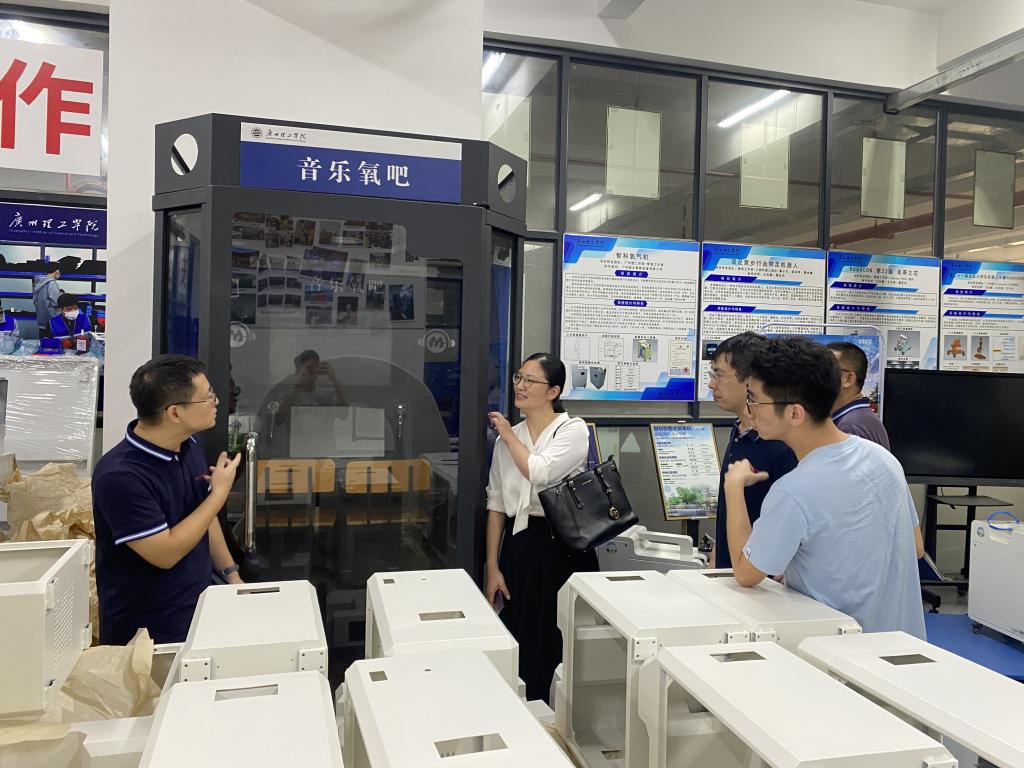 广汽集团代表参观了智造先锋工作室的制氧机项目,观看了其部分组成和制氧机项目衍生出的多元项目,包括创新性十足的音乐氧吧以及高压氧仓等项目,由工作室负责人王如意老师及徐诗友、周家勇等指导老师,向广汽集团代表团作详细介绍,深入了解项目的技术原理、设计概念。