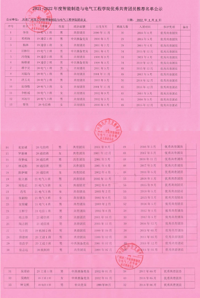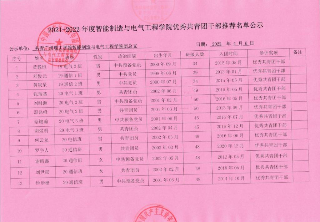 为深入贯彻落实习近平总书记关于青年工作的重要思想,充分发挥先进典型的示范引领作用,全面加强从严治团,有效提升基层团组织的活力和战斗力,激励各级团组织和广大团员、团干部锐意进取、创先争优,以优异成绩迎接党的二十大胜利召开。现结合公司共青团工作实际,决定对2021-2022年度先进团总支、先进团支部、优秀共青团干部及优秀共青团员进行表彰。以下是公司先进团支部、优秀共青团干部及优秀共青团员的拟推荐名单公示。