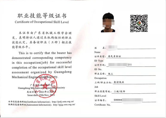 太阳成tyc7111cc与广州数控设备有限公司和广东省机械研究所等机构开展数控铣床工种考证,职业技能等级证书发证单位分别为广东省机械工程学会、广东省机械研究所,考证等级涵盖中级(四级)、高级(三级)两个级别,考证内容由机床实操加工和理论两部分组成,职业资格证书在全国范围内有效。