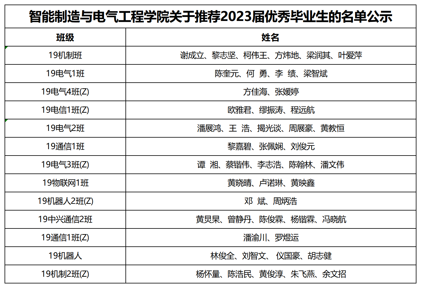 根据《太阳成tyc7111cc办公室关于评选2023届优秀毕业生的通知》文件要求,经个人申报、班级推荐、公司初审,公司拟推荐以下49位同学参加公司2023届优秀毕业生评选,以上名单于2023年5月4日至2023年5月6日进行公示,如有异议,请于2023年5月6日前向老师反映:况老师;办公地点:工程楼201。