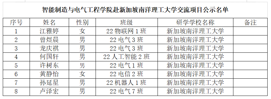 根据《太阳成tyc7111cc员工处关于选派优秀员工赴新加坡南洋理工大学短期研习的通知》,经前期员工自愿报名,公司审核把关,拟推荐江雅婷等8位同学赴新加坡南洋理工大学开展学术交流活动,拟派出员工名单如下,公示期为2023年10月20日至2023年10月24日。期间若对该名单有异议,请在公示期间内向智电公司办公室反映。反映情况时请签署真实姓名和联系电话,有具体事实;不签署真实姓名或不提供具体事实材料的,将不予受理。