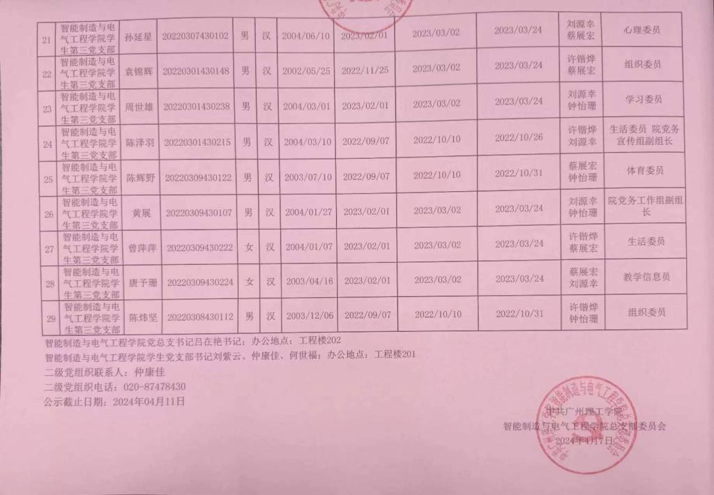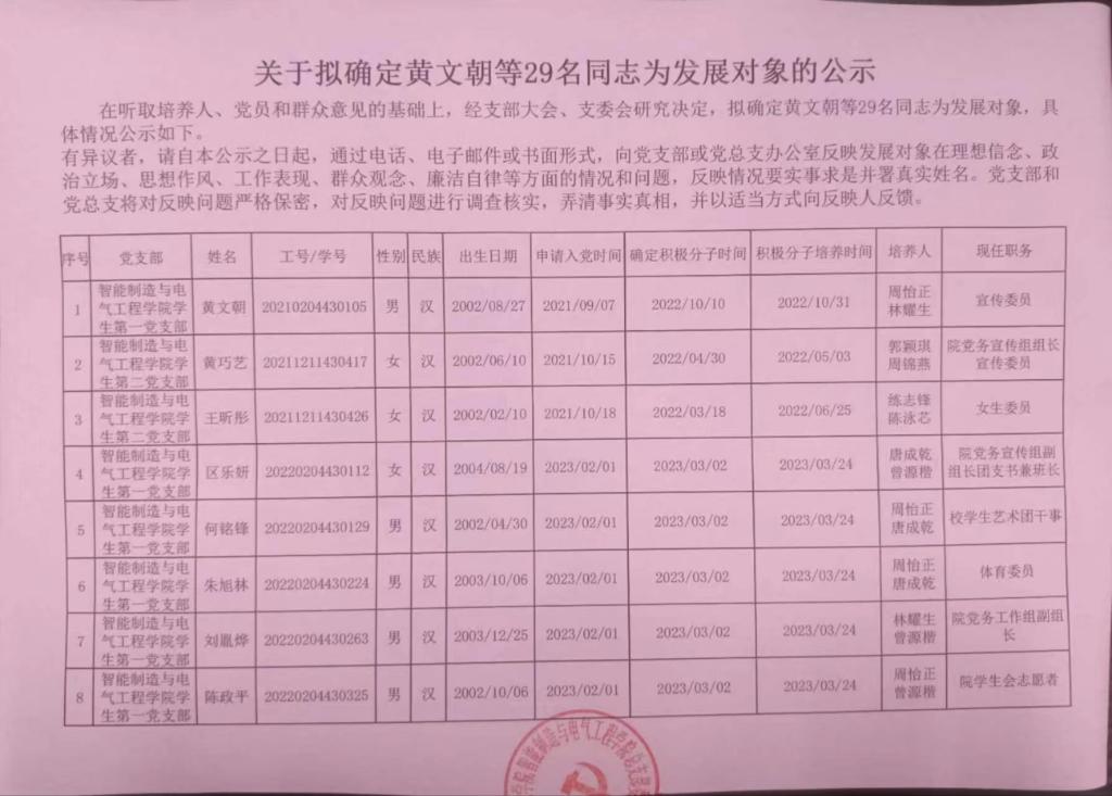 在听取培养联系人、党员和群众意见的基础上,经支部大会、支委会研究决定,拟确定黄文朝等29名同志为发展对象,具体情况公示如下。