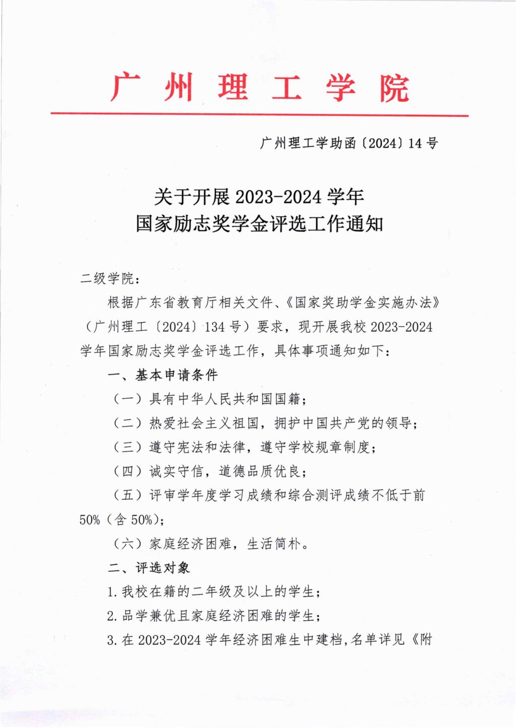关于开展2023-2024学年国家励志奖学金评选工作通知
