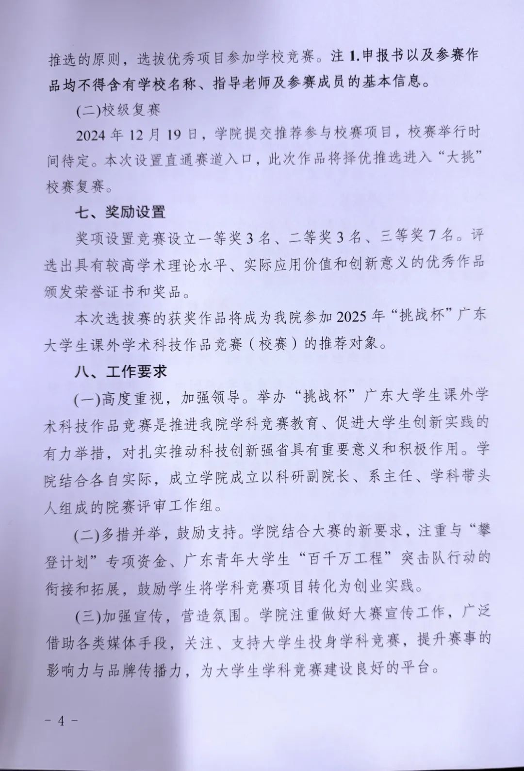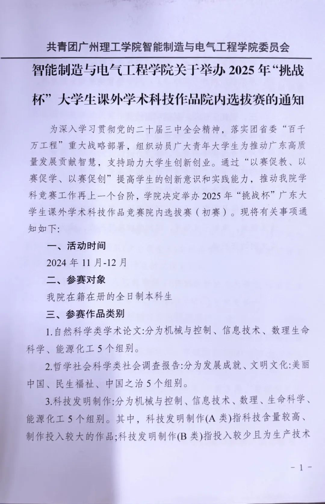 为深入学习贯彻党的二十届三中全会精神,落实团省委“百千万工程”重大战略部署,组织动员广大青年老员工为推动广东高质量发展贡献智慧,支持助力老员工创新创业。通过“以赛促教、以赛促学、以赛促创”提高员工的创新意识和实践能力,推动公司学科竞赛工作再上一个台阶,公司决定举办2025年“挑战杯”广东老员工课外学术科技作品竞赛院内选拔赛(初赛)。现将有关事项通知如下: