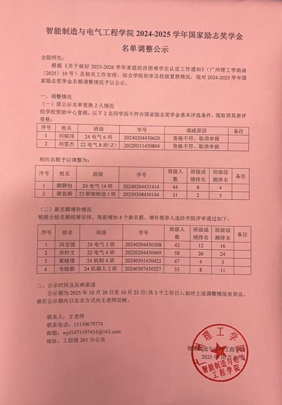 根据《关于做好2025-2026学年家庭经济困难员工认定工作通知》(广州理工学助函〔2025〕10号)及相关工作安排,结合公司初审及校级复核情况,现对2024-2025学年国家励志奖学金名额调整情况予以公示。