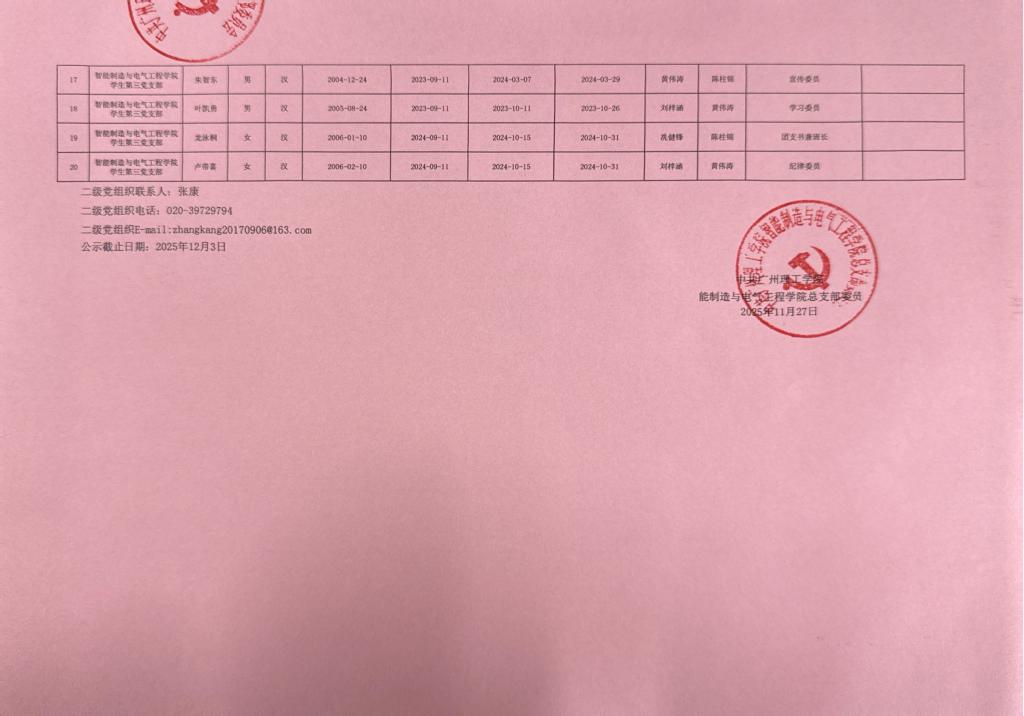 经党支部、党总支审查,拟将黄浩等20名同志发展为中共预备党员,为增强发展党员工作的透明度,强化群众的监督作用,减少工作失误和偏差,确保党员发展工作质量,根据发展党员工作有关要求,现将具体情况公示如下。