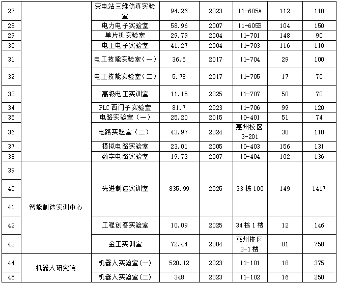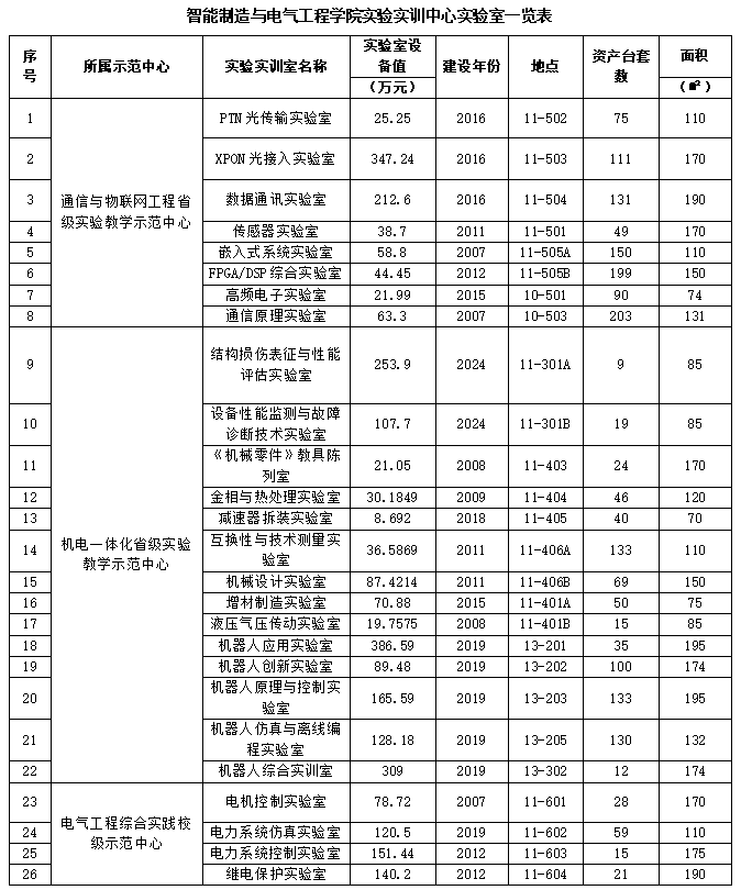 智电公司实验实训中心现有2个省级实验教学示范中心、1个校级综合实践示范中心、智能制造实训中心以及人工智能与机器人研究院实验室,共有实验室45间,实验室面积7700多㎡,教学科研仪器设备总值5000余万元,为智能制造工程、电气工程及其自动化、机械设计制造及其自动化、机器人工程、自动化、电子信息工程、通信工程7个本科专业的教学和科研提供有力支撑。全学年接纳实验26697人次,达5528实验学时。公司成立有实验实训中心,负责实验室的建设与日常管理。实验室的所属及分布见一览表。